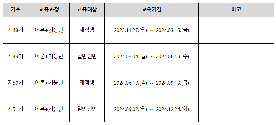 HOME > 교육생 모집 > 연간 교육계획(신규) 교육생 모집교육계획 교육생 모집공고 연간 교육계획(신규) 연간 교육계획(갱신) 연간 교육계획(신규) 2026년 철도사관학교 면허교육 계획(제2종 전기차량운전면허-신규) 전형 절차 및 접수 방법 – 전형 절차 – 각 기수별 전형 일정은 철도사관학교 내부 사정에 따라 변경될 수 있습니다. – 원서 접수 방법 : E-Mail 접수 – 원서 접수 제출 서류 : 응시원서 1부, 개인정보 수집·활용 동의서 1부[응시원서 양식 앞/뒷면] 2026년 철도사관학교 면허교육 계획(제2종 전기차량운전면허-갱신)