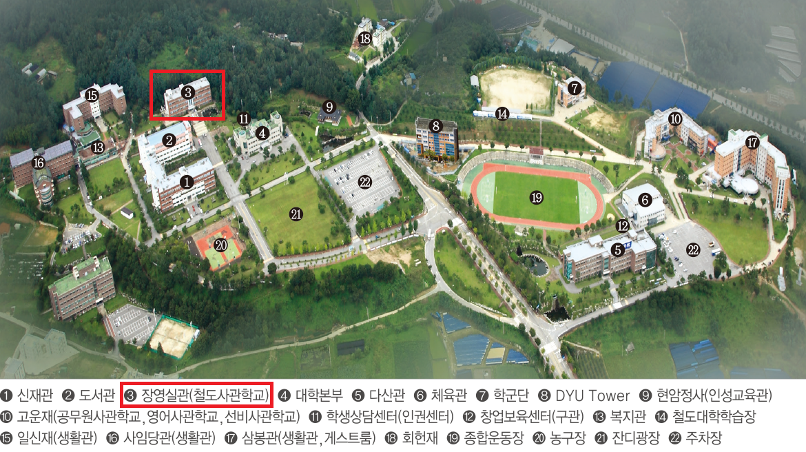 HOME > 소개 > 찾아오시는 길 학교소개원장 인사말 주요연혁 교수별 소개 조직도 찾아오시는 길 찾아오시는 길 <동양대학교 철도사관학교 주소> 경북 영주시 풍기읍 동양대로 145 동양대학교 철도대학(장영실관) 1층 사무실: 3101호 / 전화: 054-630-1400 / 팩스: 054-630-1401 <동양대학교 철도사관학교 교내 위치>